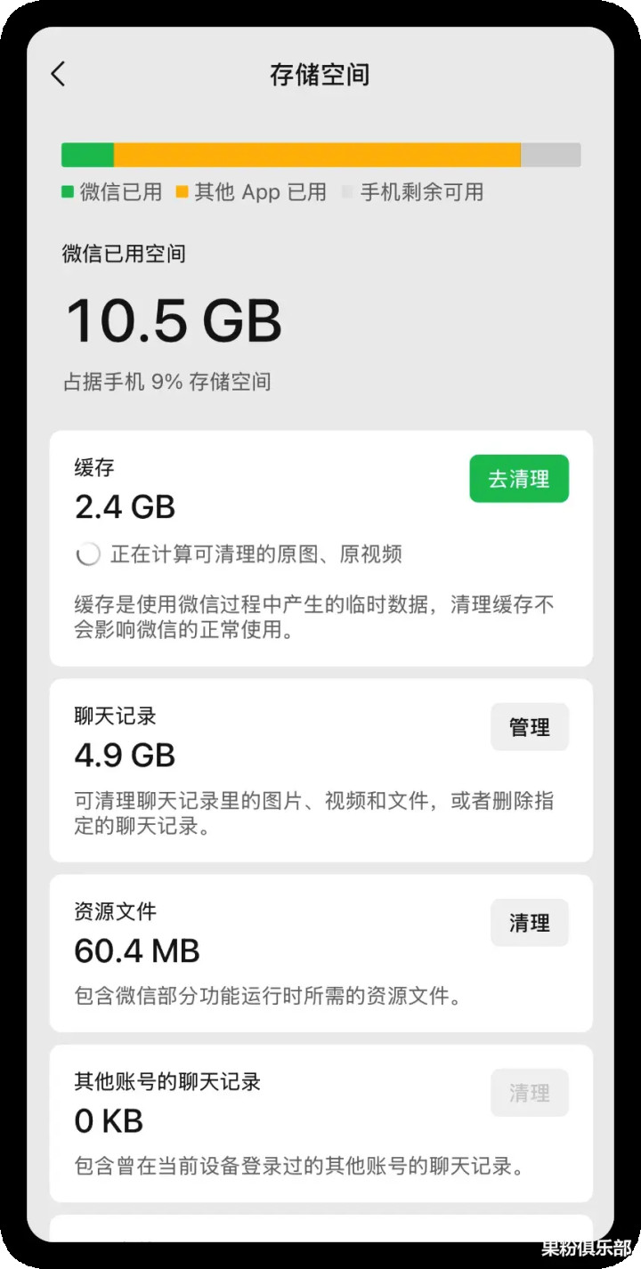 基本上一个微信本体加聊天记录,就能达到两位数的存储占用。